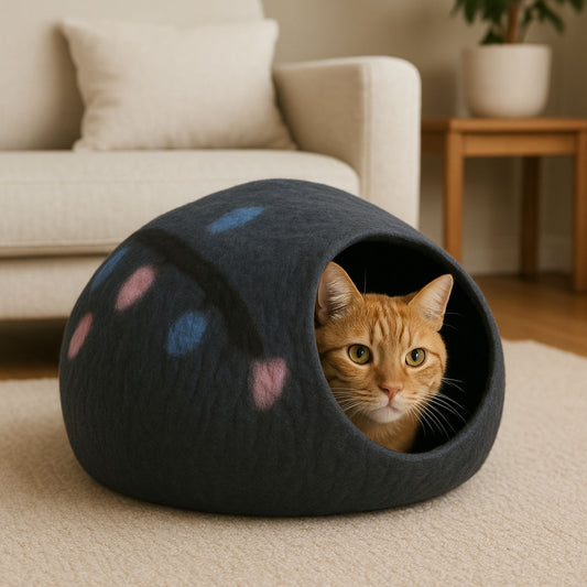 Luxury Felt Cat Cave – Handcrafted Wool Retreat – Charcoal Cream